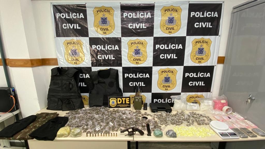 Mil porções de maconha e cocaína, um revólver calibre 32, com numeração raspada e dez munições, dois coletes balísticos, duas balaclavas, quatro balanças, centenas de embalagens para acondicionar entorpecentes, um aparelho identificador de sinal e um bloqueador foram apreendidos, nesta quarta-feira (8), em Feira de Santana.