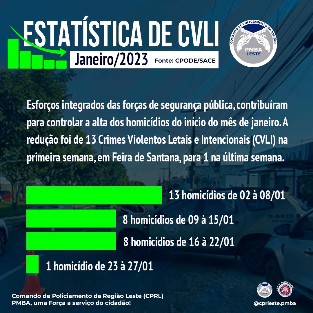 Esforços integrados das forças de segurança pública, contribuíram para controlar a alta dos Crimes Violentos Letais e Intencionais (CVLI) da primeira semana do mês de janeiro, em Feira de Santana.