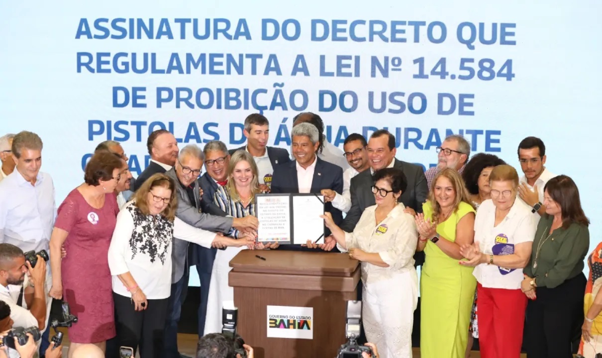 Foi sancionada pelo Governo da Bahia nesta segunda-feira (29) a lei que proíbe o uso de pistolas de água no Carnaval e em festas populares ocorridas no estado. De acordo com o decreto, haverá fiscalização e as armas flagradas com foliões serão recolhidas, seja nos portais de acesso dos circuitos do Carnaval ou dentro dos espaços da festa. Na cerimônia de assinatura da lei nº 14.584, o governador Jerônimo Rodrigues destacou que as medidas adotadas são para acabar com esta prática.