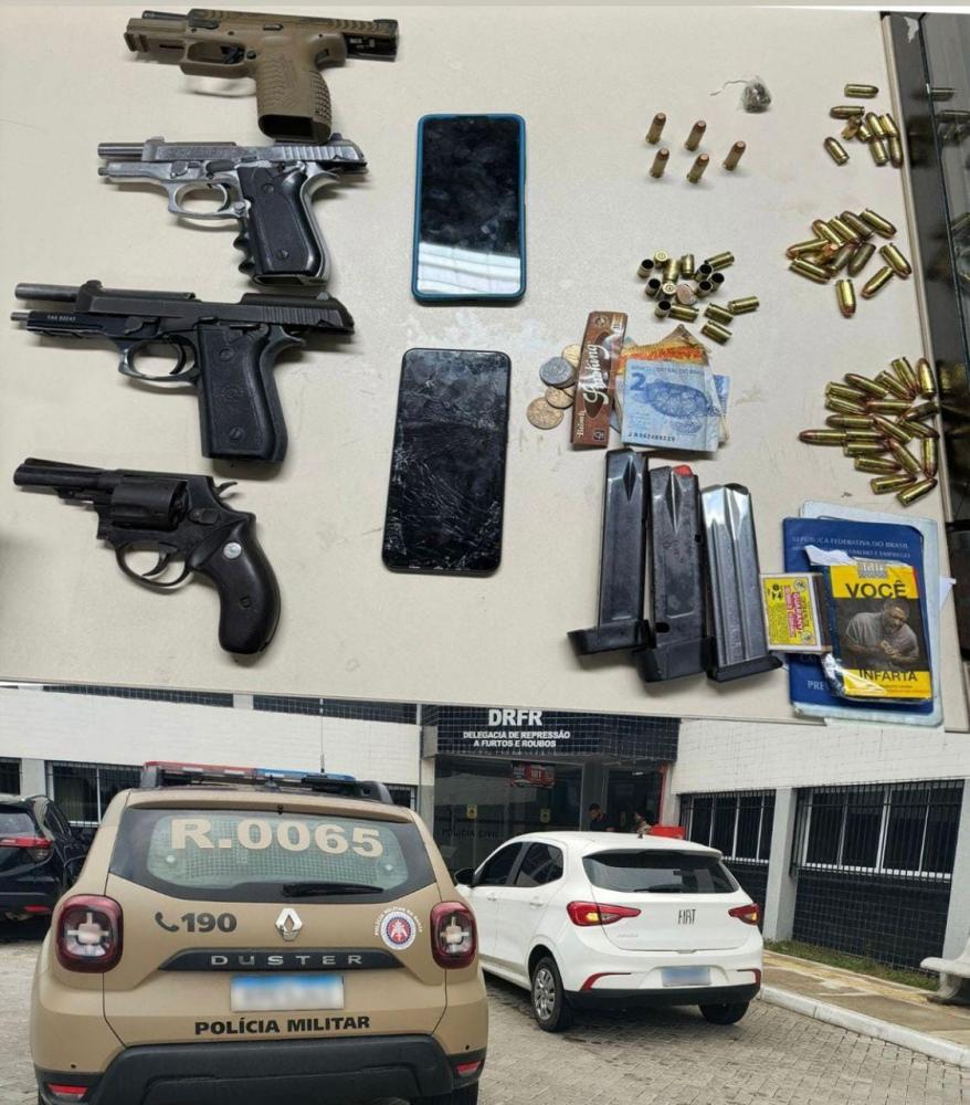 Com eles, foram encontrados um carro, três pistolas de calibres 40mm, 9mm e 380, além de um revólver calibre 38. Os conduzidos e todos o material apreendido foram apresentados na delegacia que atende à região, para o registro da ocorrência.