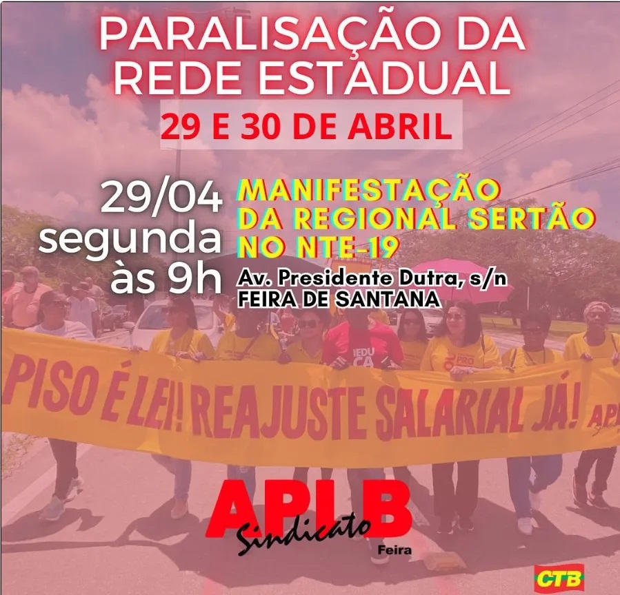 A diretoria da APLB Feira convoca os trabalhadores em educação da Rede Estadual para manifestação da Regional Sertão nesta segunda-feira, 29, às 9h (Avenida Presidente Dutra, s/n), no Núcleo Territorial de Educação – NTE 19, em Feira de Santana.